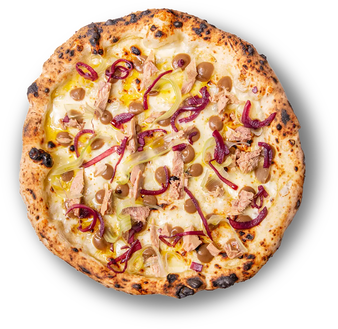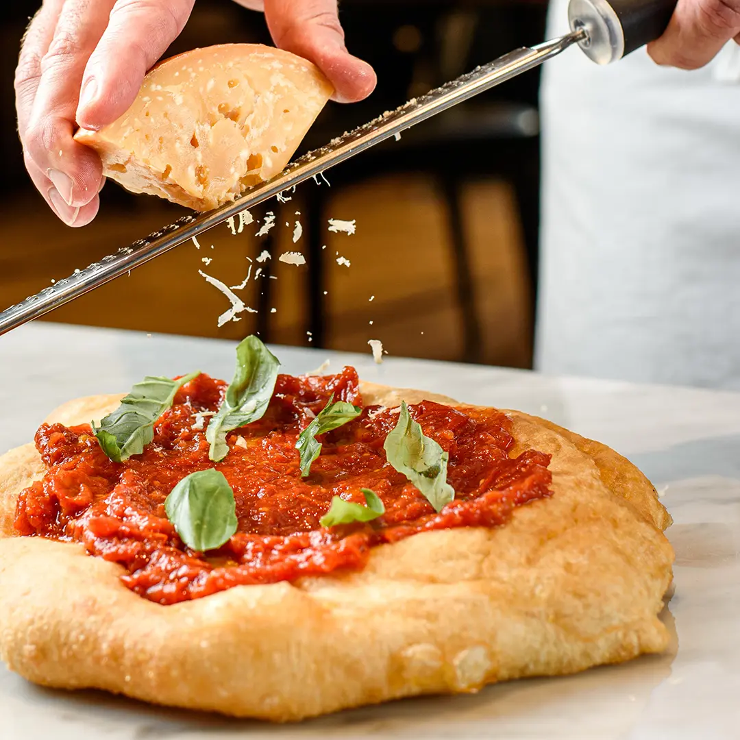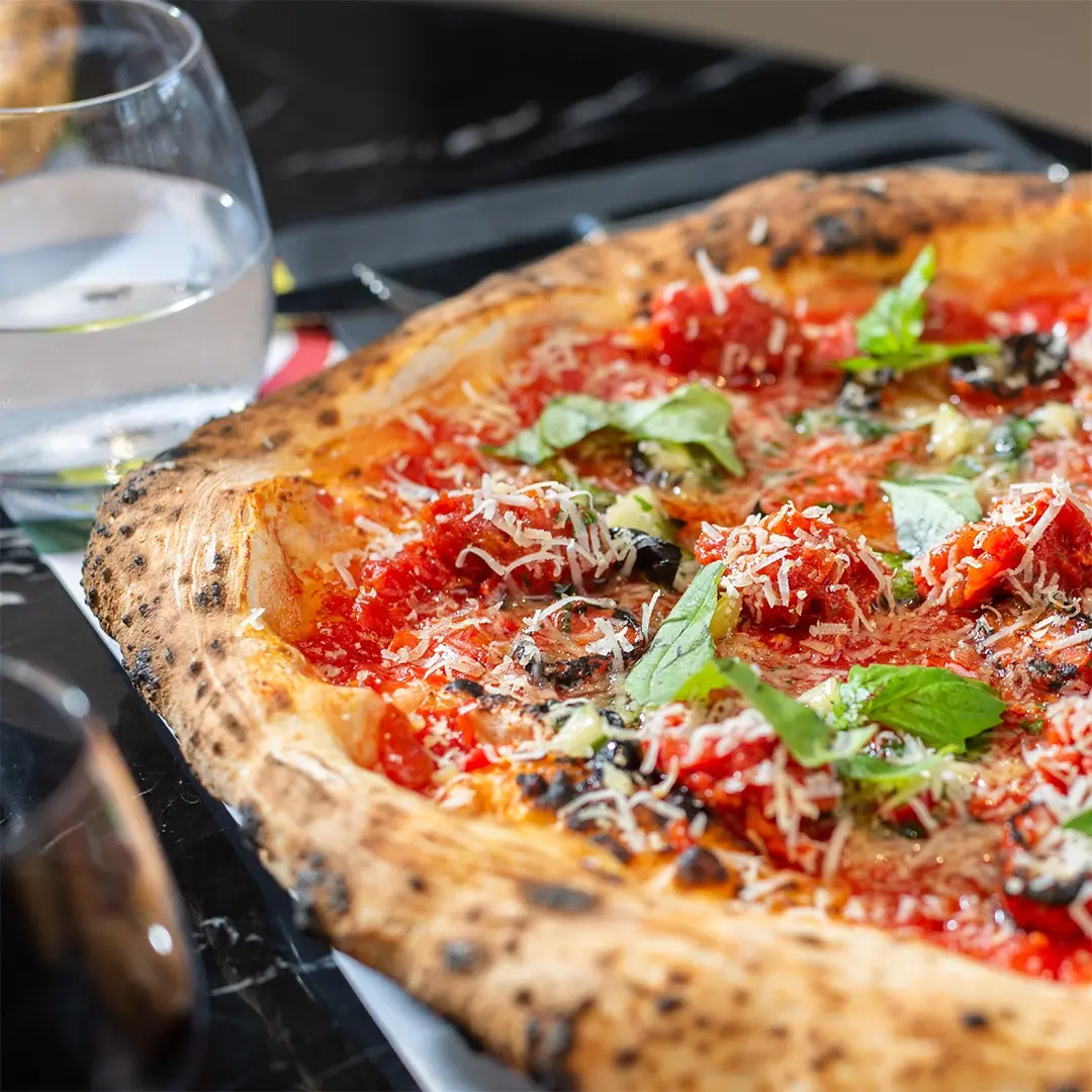L’impasto delle nostre pizze lievita più di 24 ore a temperatura ambiente e utilizziamo due tipologie di farine che danno sapore e struttura. Il risultato è un impasto morbido, soffice ed elastico.